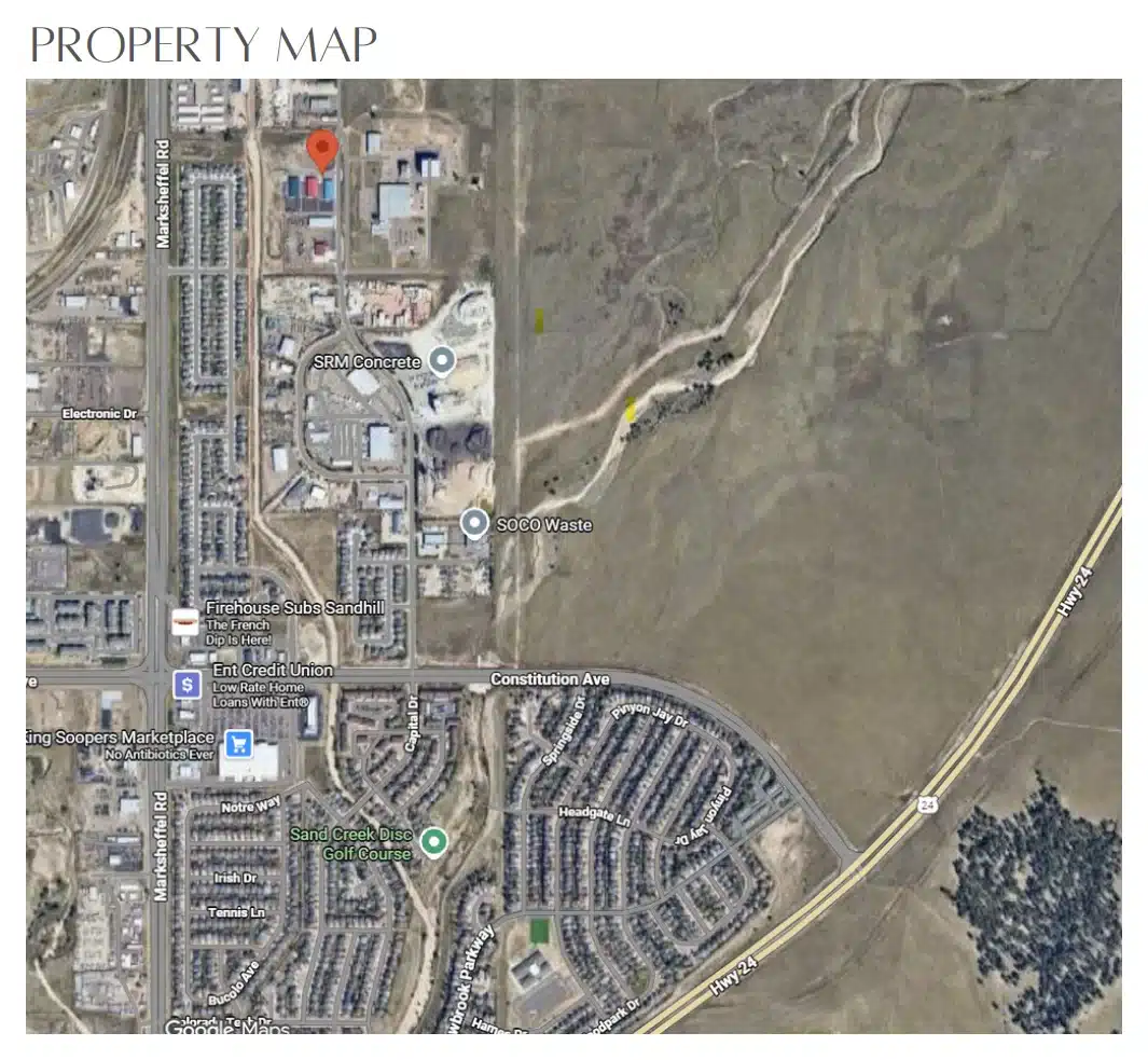 Great industrial property just off of Marksheffel Rd. Property consists of 9,691 Square feet and sits on a 1.07 acre lot. Fully fenced storage yard along with off street parking up front. Building has roughly 1,500 square feet of office space and remainder is warehouse. 2 overhead doors leading to the fenced yard. Current zoning is LI AO.